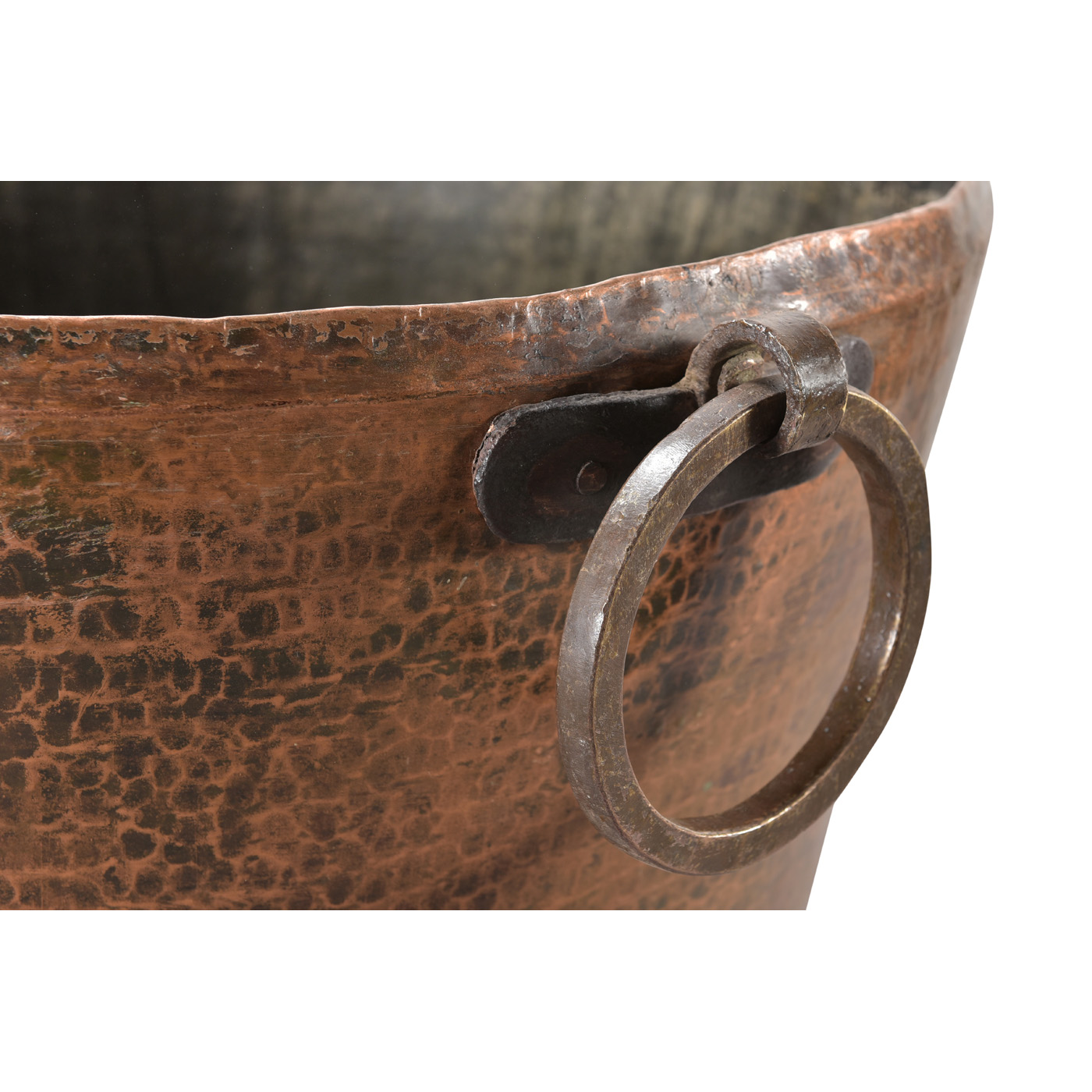 Bring Old World and timeless craftsmanship into your space with this antique hammered copper pot. Featuring a rich, warm patina, this piece tells a story of tradition and beauty. The hand-hammered texture across the surface gives it a tactile and artisanal quality. The dark copper finish adds character and depth. Two round decorative handles attach to the sides with reinforced copper. We love to use this planter for small trees or simply as décor.