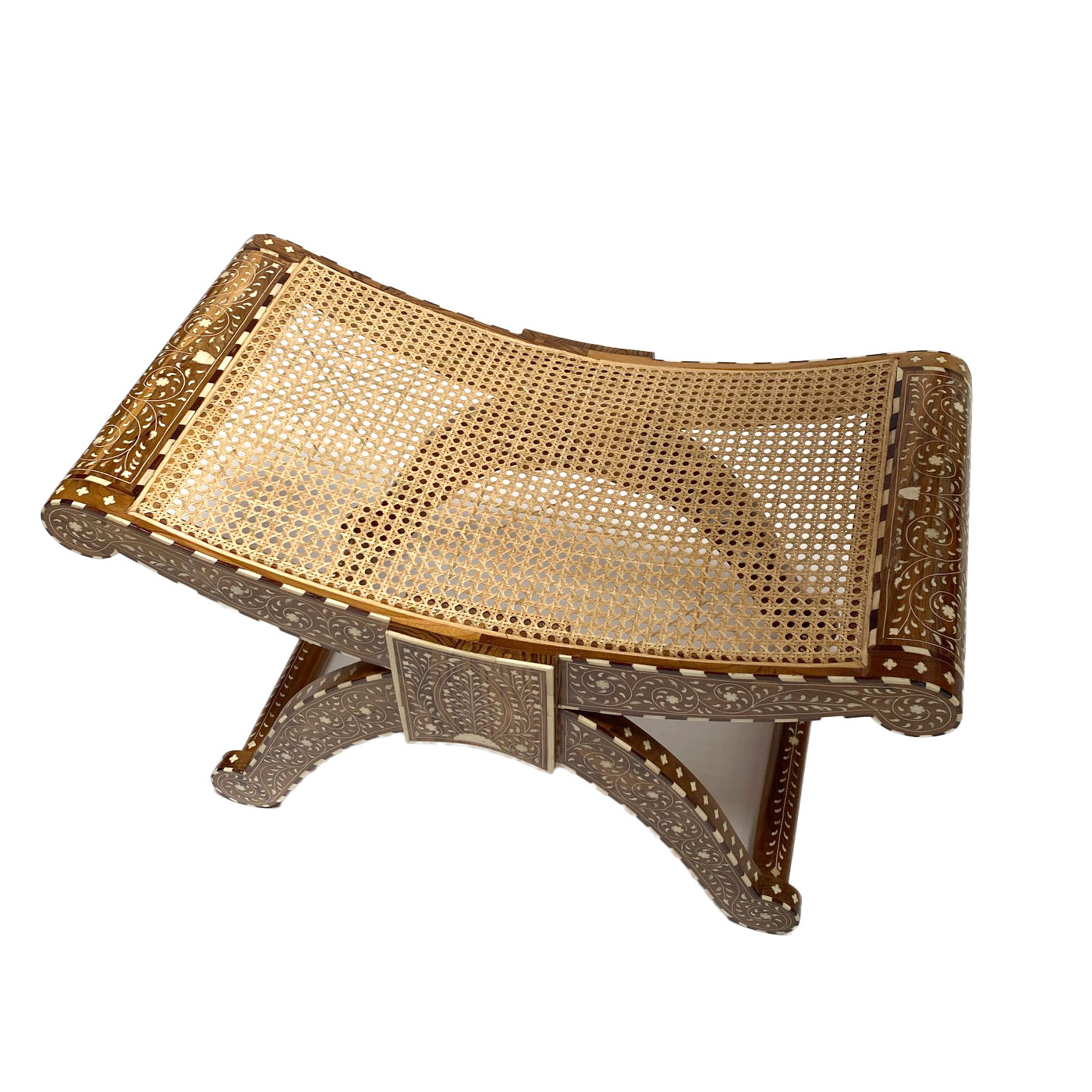 Furnishings, Furnishings- ALL, SeatingOur Inlay Cane Bench Stool is hand-carved from teakwood and inlaid with bone. Flowing flowering vines adorn the legs and perimeter of the bench. We recommend using a cushion with this bench to help distribute weight placed on the cane.$1,500.00- Bone inlay stool